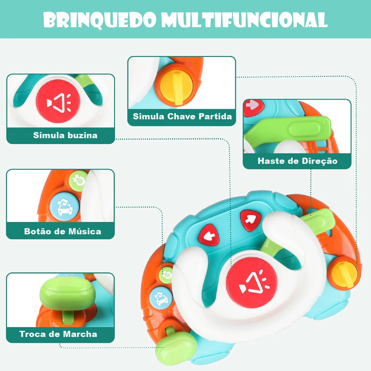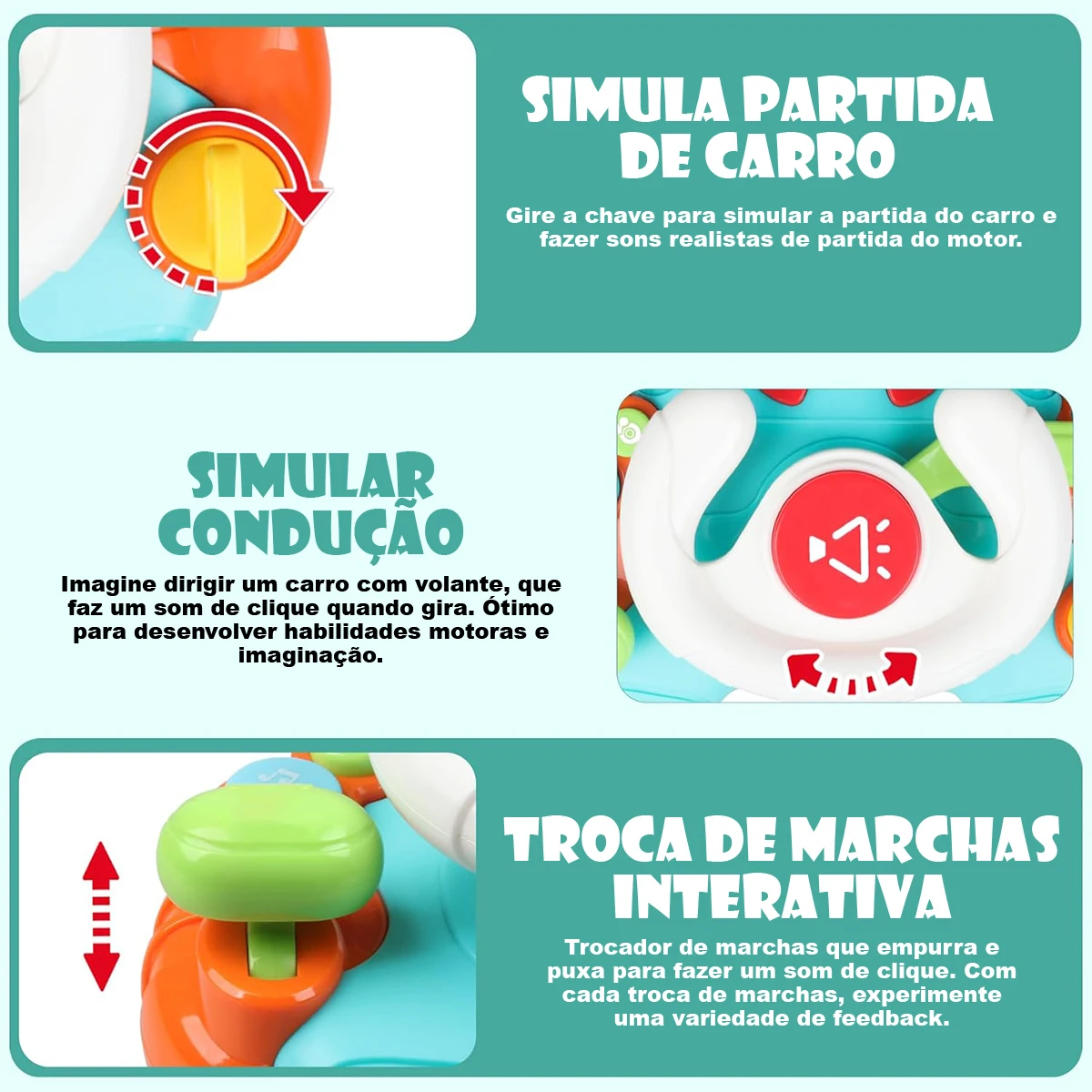 Brinquedo Montessori para educação infantil: esse brinquedo Montessori envolve as crianças com música e luzes, ativadas por meio de botões. Elas podem fingir que estão dirigindo, girando a chave para ligar o motor, tocando a buzina, trocando as marchas, ativando o pisca-pisca e girando o volante, tudo isso enquanto simulam sons realistas de carros. Com suas funções interativas, esse brinquedo aprimora as habilidades motoras finas e a coordenação mão-olho, sendo adequado para brinquedos de educação infantil para meninos e meninas de 1 a 3 anos de idade